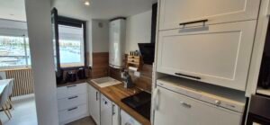 Le coin cuisine avec lave linge, lave vaisselle, four, four micro-onde, réfrigérateur congélateur, petits électroménagers .