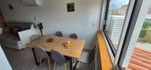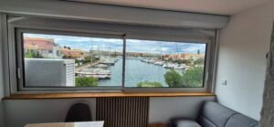La loggia fermée offre un 3è espace nuit avec un bz et le coin repas avec une vue sur la mer et les bateaux.
