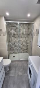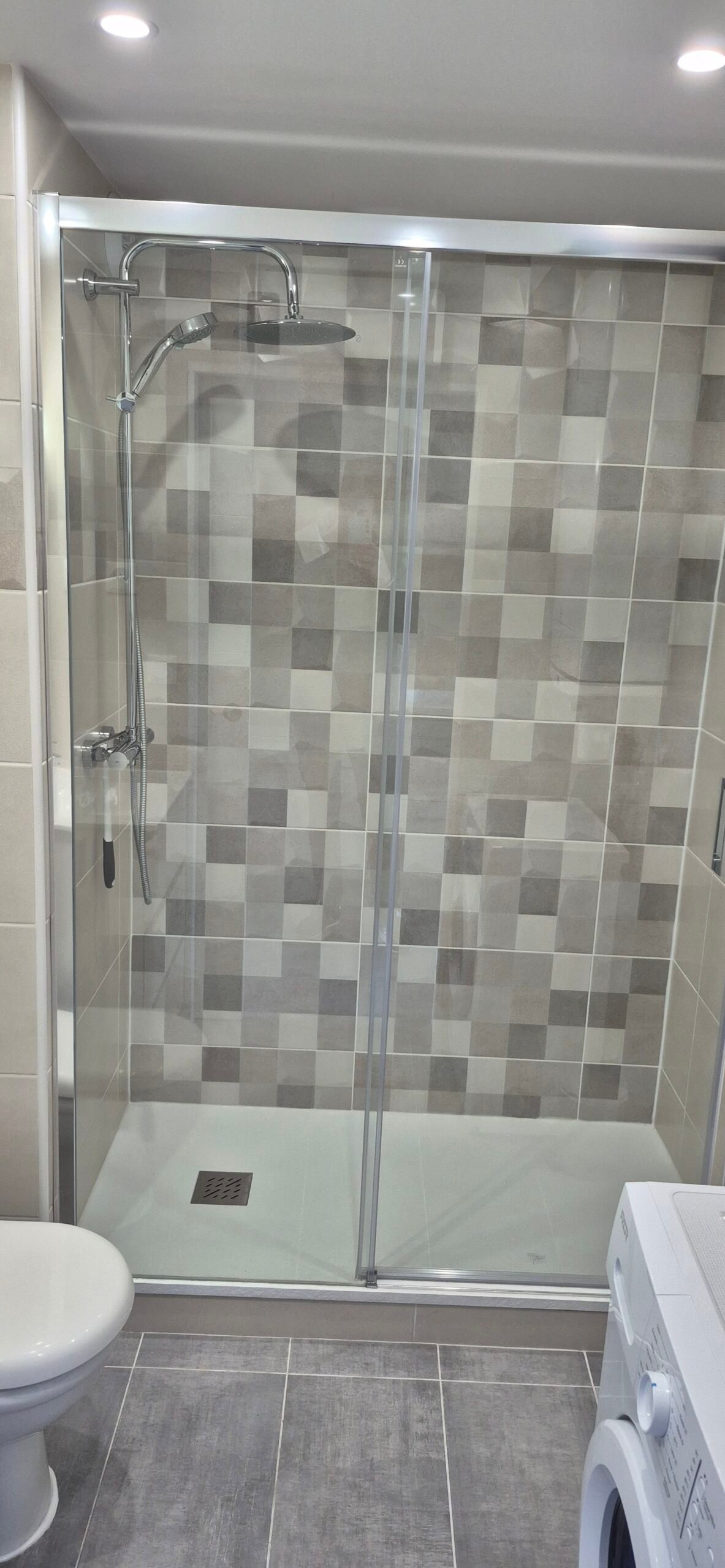 Une salle de bain avec douche italienne et lave-linge.