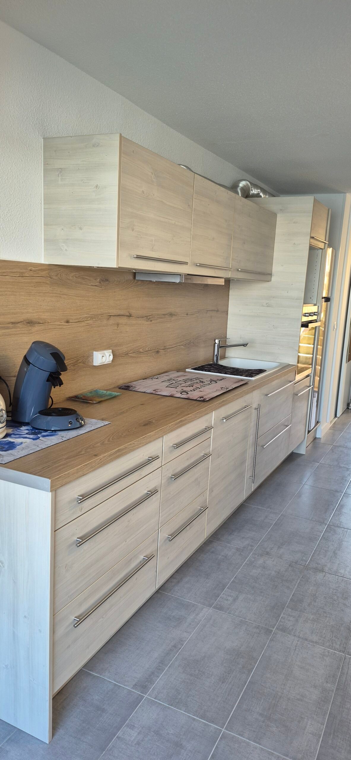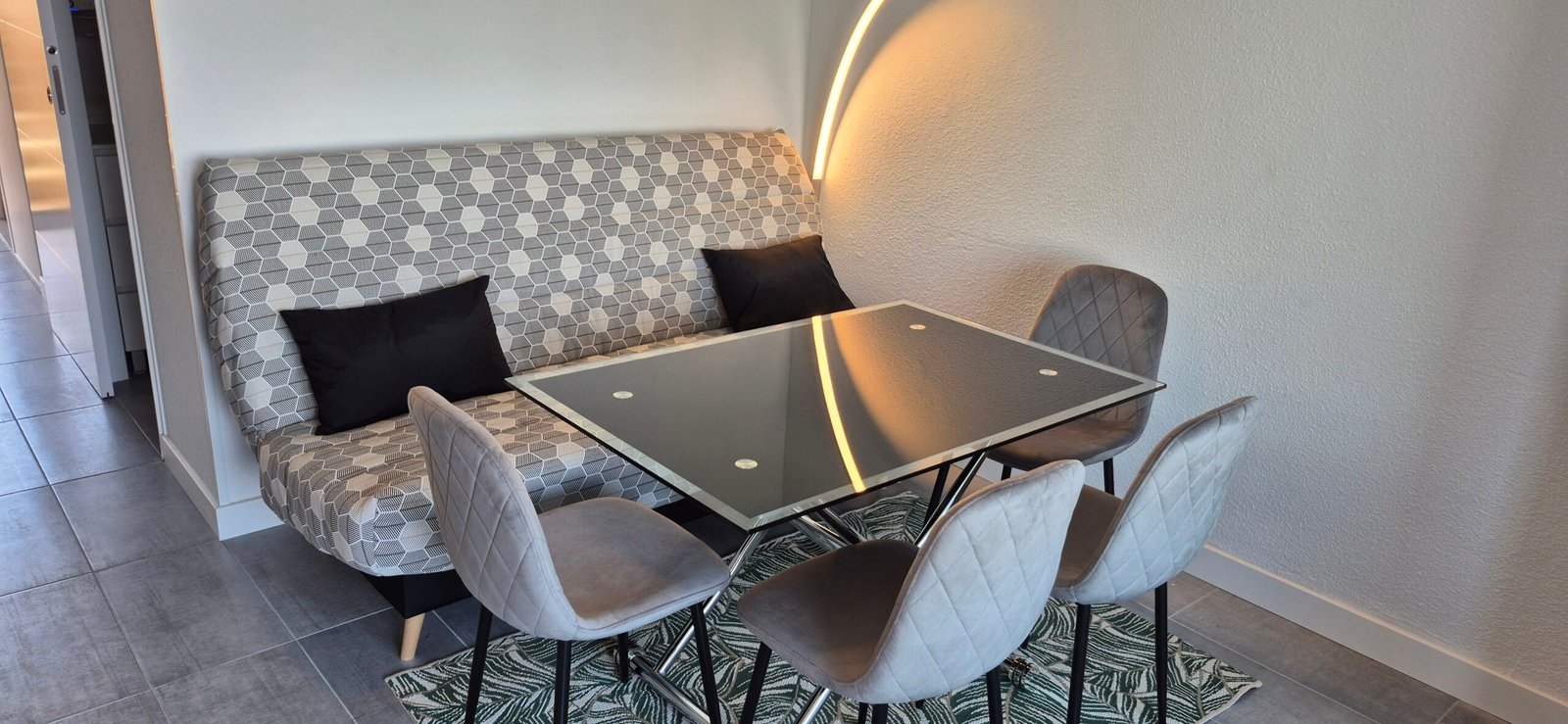 Une pièce de vie avec un canapé convertible clic-clac, une cuisine équipée :