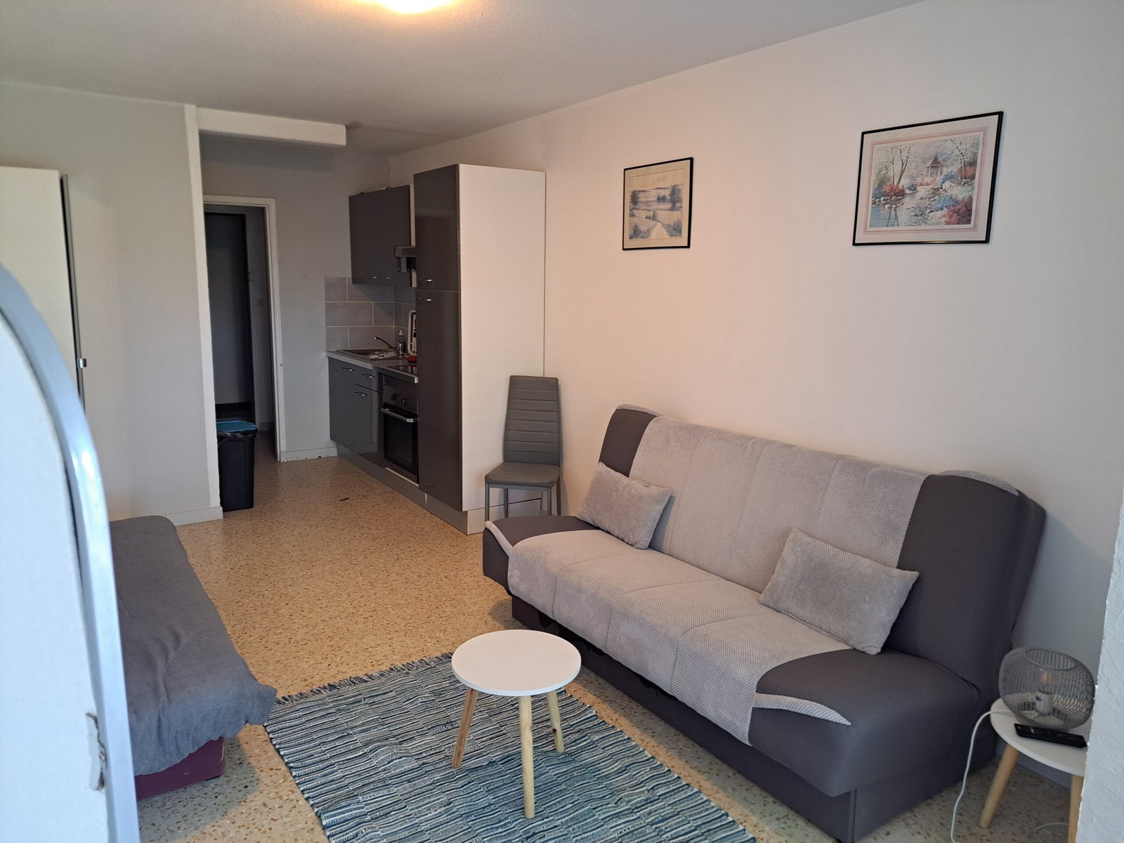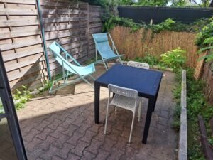 2 canapés lits donnant sur une terrasse sans vis à vis et ombragée.