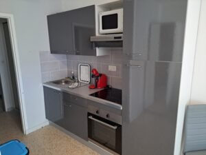 Cuisine équipée, four, plaque, hotte, micro-onde, cafetière, réfrigérateur.