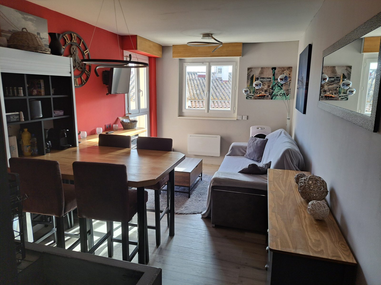 Logement de 40 m² offrant de belles prestations situé au 3ème étage. Il est tout équipé (télévision écran plat, lave-linge 8kg, réfrigérateur avec freezer, plaques en vitrocéramique 2 feux avec hotte, lave-vaisselle 12 couverts, four micro-onde cuisson vapeur, cafetière à filtre, cafetière Nespresso, grille pain, bouilloire, 2 rafraichisseurs, sèche serviette, sèche cheveux, table et fer à repasser...). Il est équipé d'un canapé lit (type rapido 140*190) dans le séjour, d'un lit 2 personnes king size (160*190) dans la mezzanine et d’un lit superposé (2x90*190) dans la chambre. La mezzanine peut être isolée de la chambre grâce à une porte coulissante verrière.