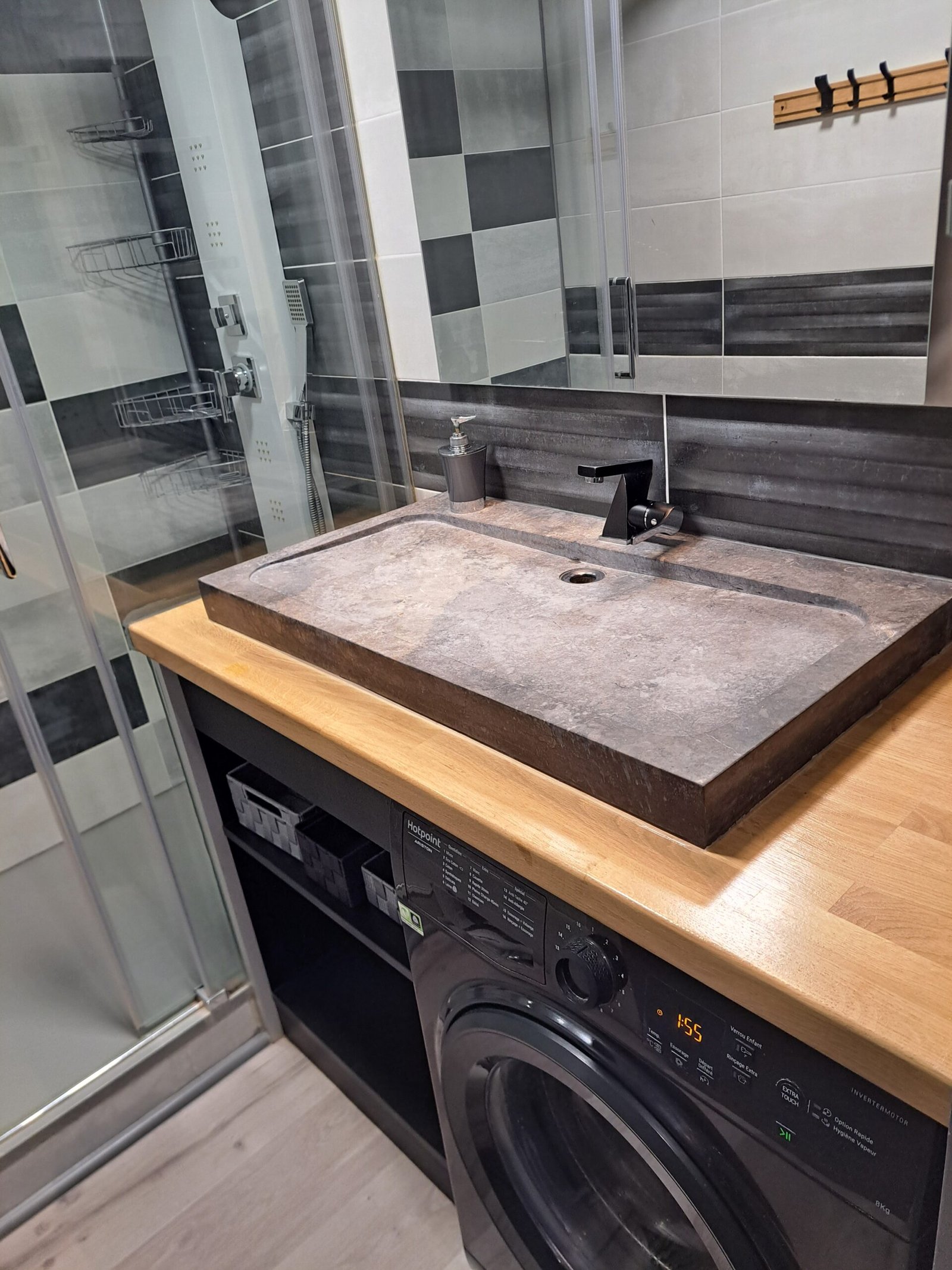Salle de douche moderne avec son lave linge.